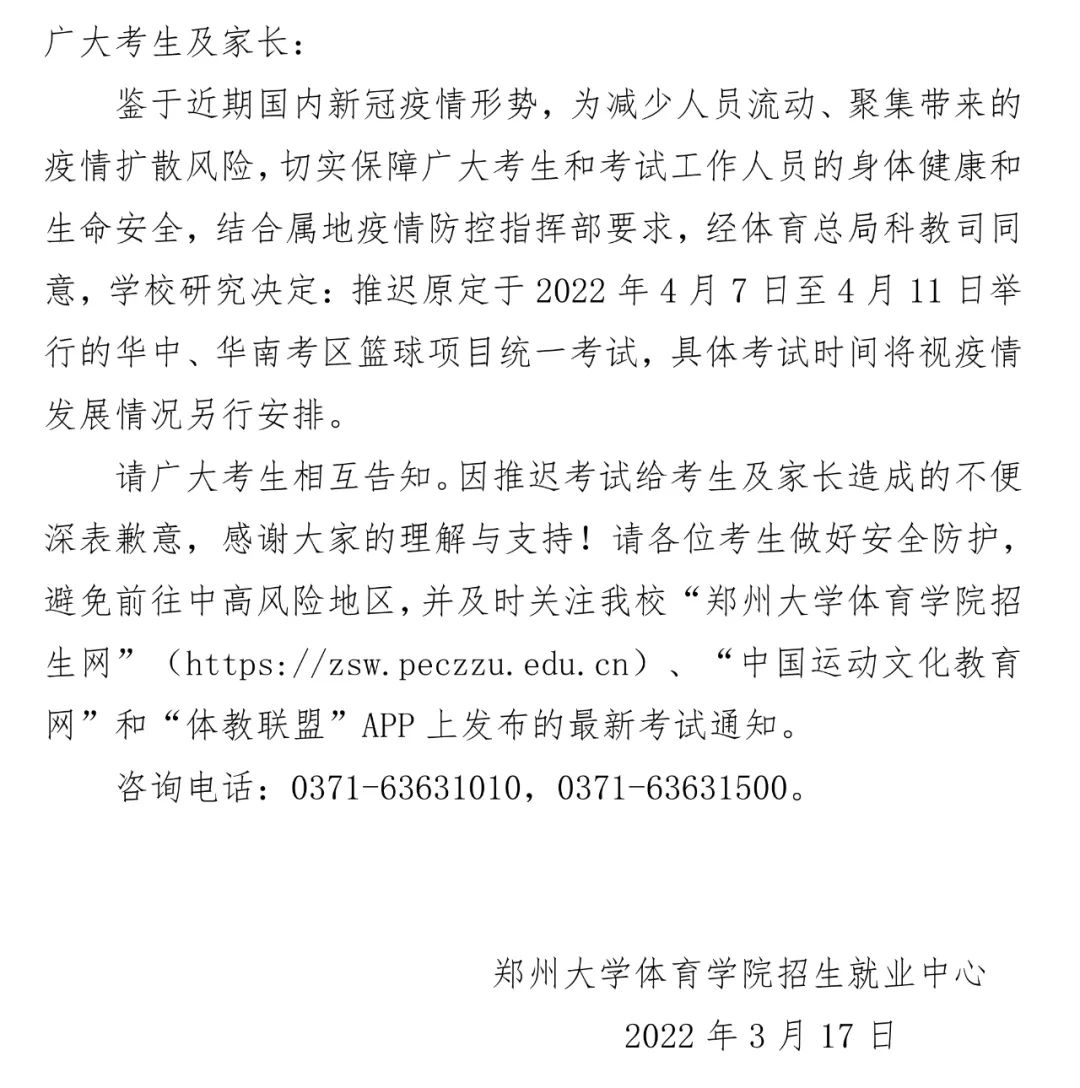 郑州大学体育学院考点|关于推迟2022年运动训练、武术与民族传统体育专业招生考试华中、华南区篮球项目考试时间的通知